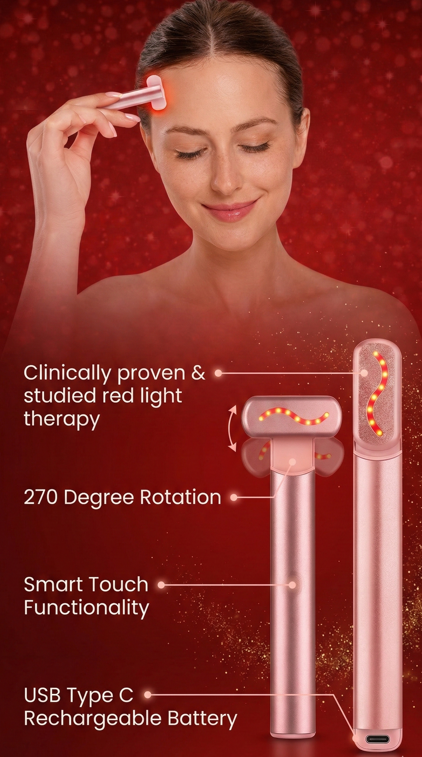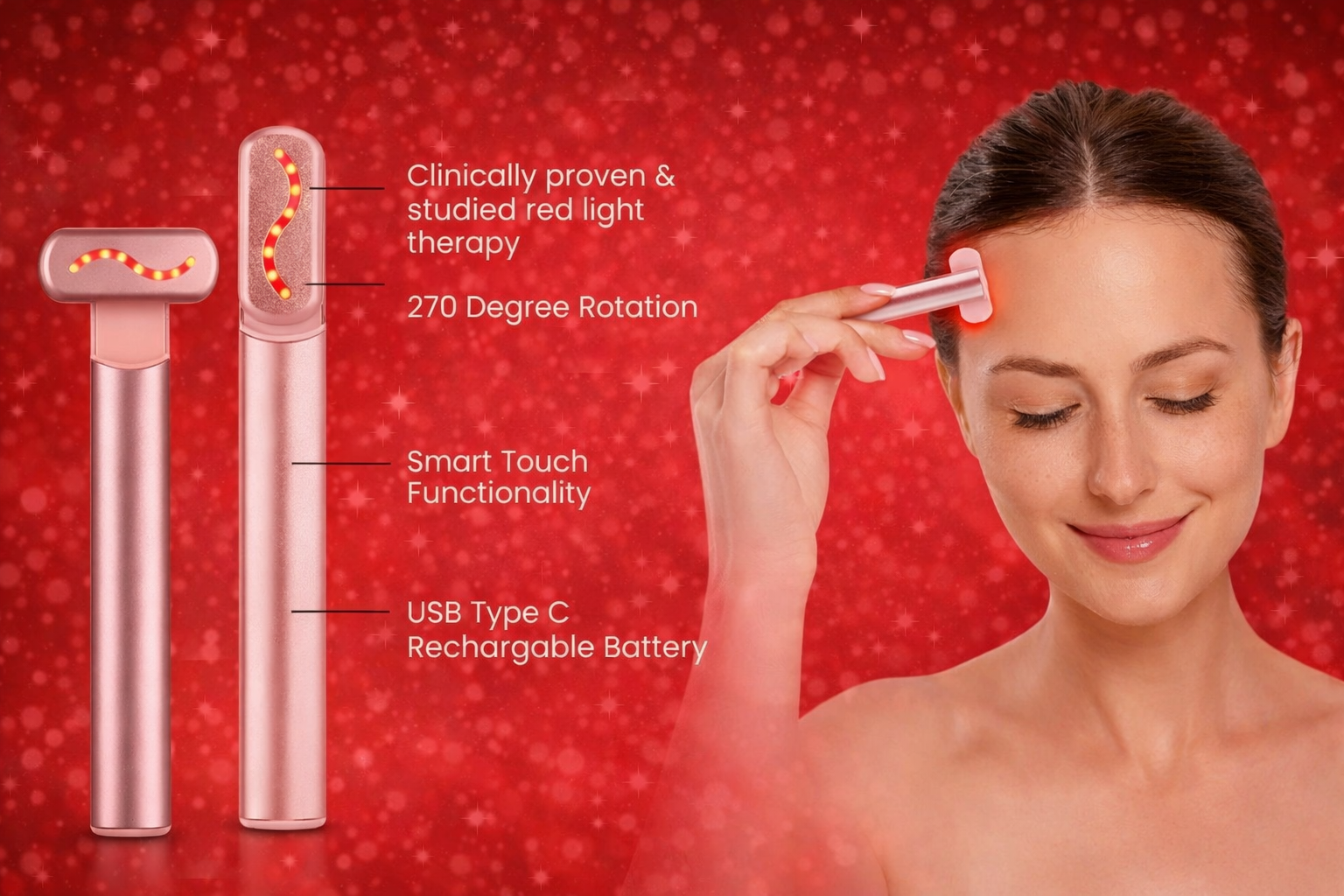 Claims are based on an independent consumer perception study and an expert assessment by a dermatologist in an independent clinical study involving 38 individuals. The study involved using the 4-in-1 Red Light Wand five times a week for an eight-week period.
